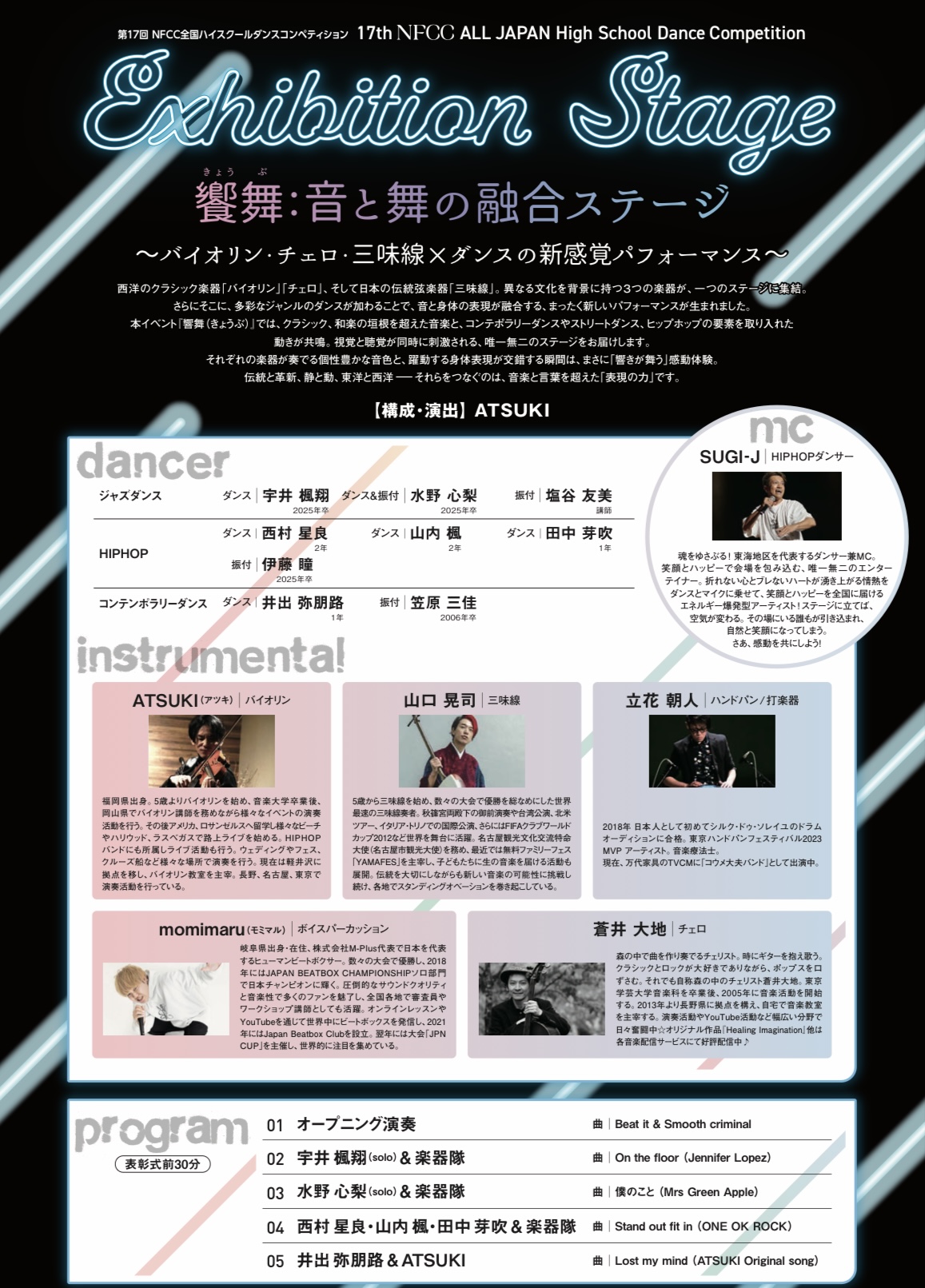 審査・各校の演技が終わった後のスペシャルステージとして、バイオリン、チェロ、三味線、ハンドパン&打楽器、ビートボックスという、異色の5人編成でパフォーマンスを披露。
