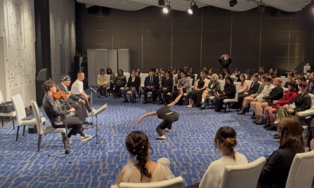 僕と今回の卒業生お二人、そして同じく学校の卒業生であるダンサーの方とともに、約200名の卒業生の前でパフォーマンスを行いました。
